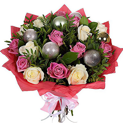 Букет “Різдвяна ніч” – дивовижна гарний мікс із троянд і зелені. Ялинкові іграшки надають композиції особливого різдвяного духу.