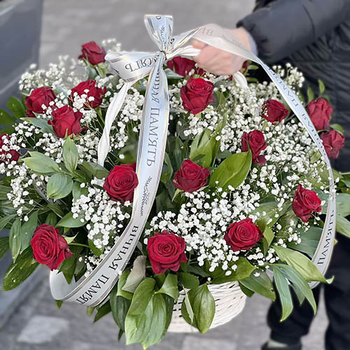 Жалобний кошик із червоних троянд та білої гіпсофіли, оточених зеленню, втілює урочисту красу та щиру скорботу. Глибокий червоний колір троянд нагадує про відданість і силу почуттів, білі суцвіття гіпсофіли надають композиції легкість і символізують чистоту пам’яті, а зелене листя створює завершеність і гармонію образу. Такий букет є зворушливим вираженням любові та поваги, залишається поруч у тиші пам’яті та зберігає світлий спогад про дорогу людину.